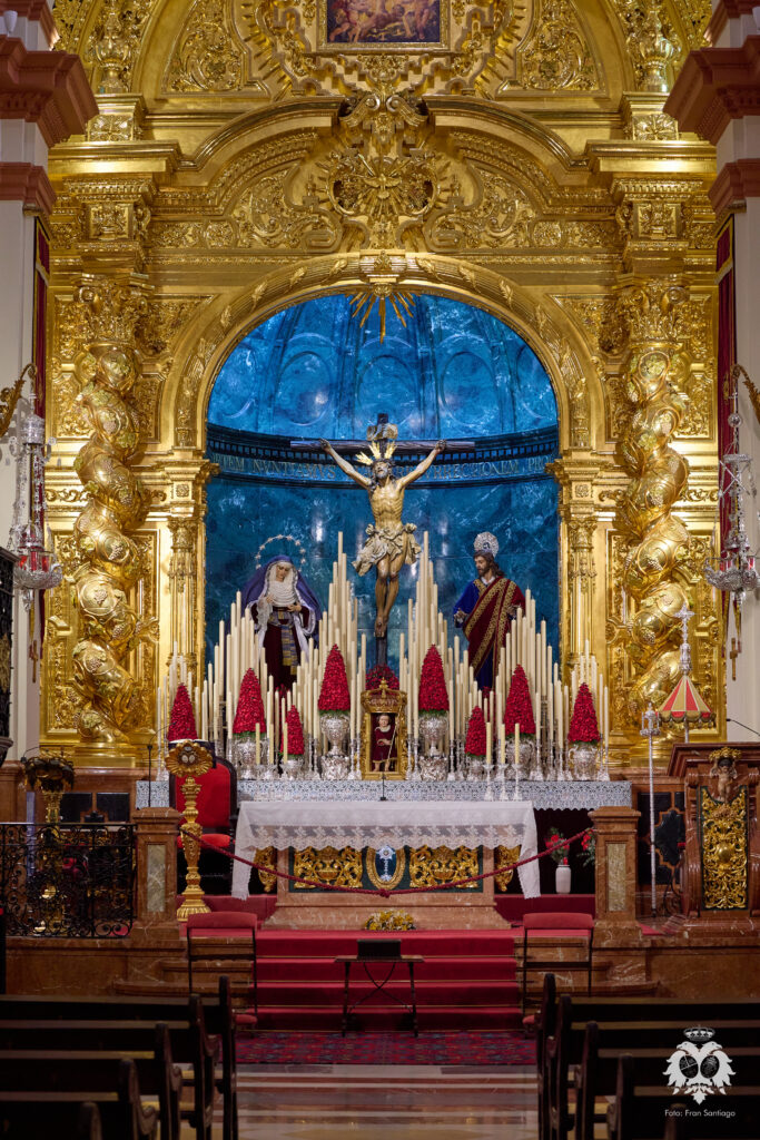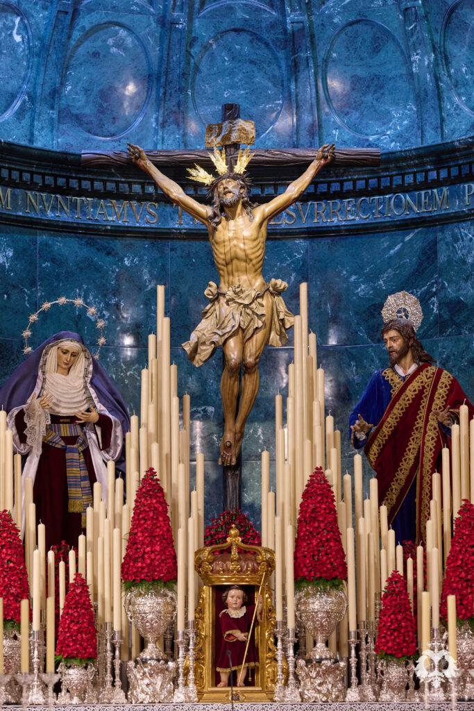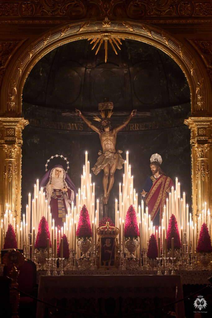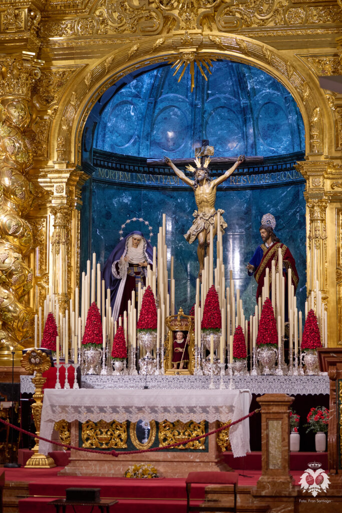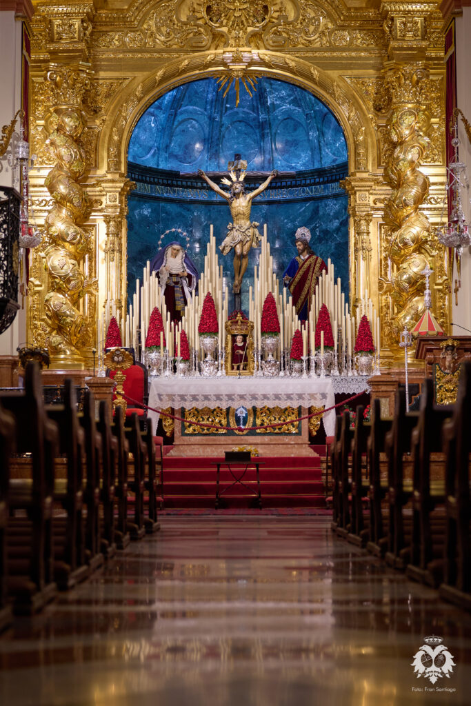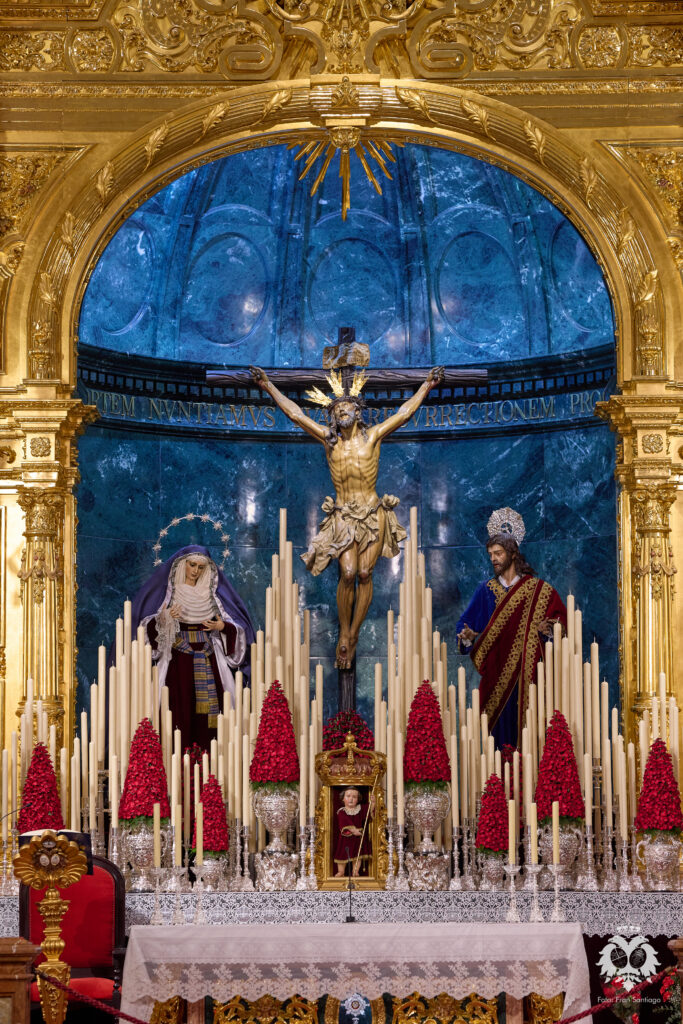 Este ha sido el altar dispuesto por parte del grupo de priostía de la Hermandad para el Solemne Quinario en honor del Santísimo Cristo de la Expiración y Nuestra Madre y Señora del Patrocinio. La Santísima Virgen ha sido vestida de hebrea como cada cuaresma por parte de su vestidor Antonio Bejarano y, para esta ocasión, completa el altar la figura de San Juan que durante el resto del año recibe culto en la Capilla Sacramental.