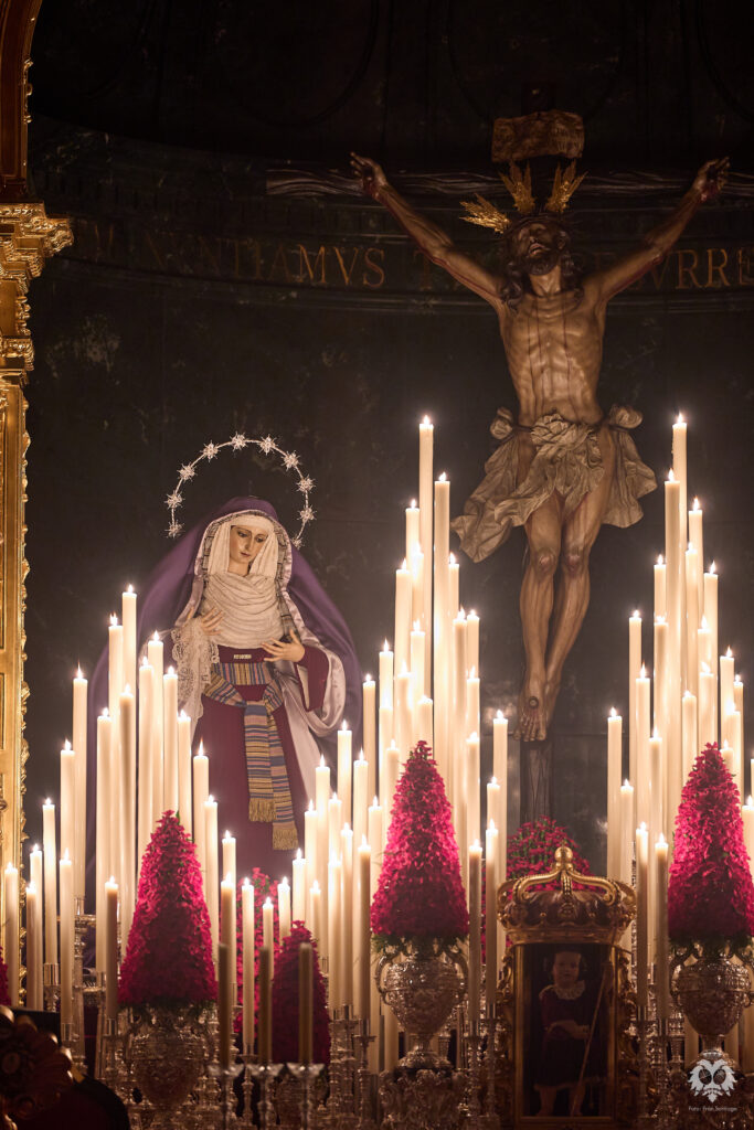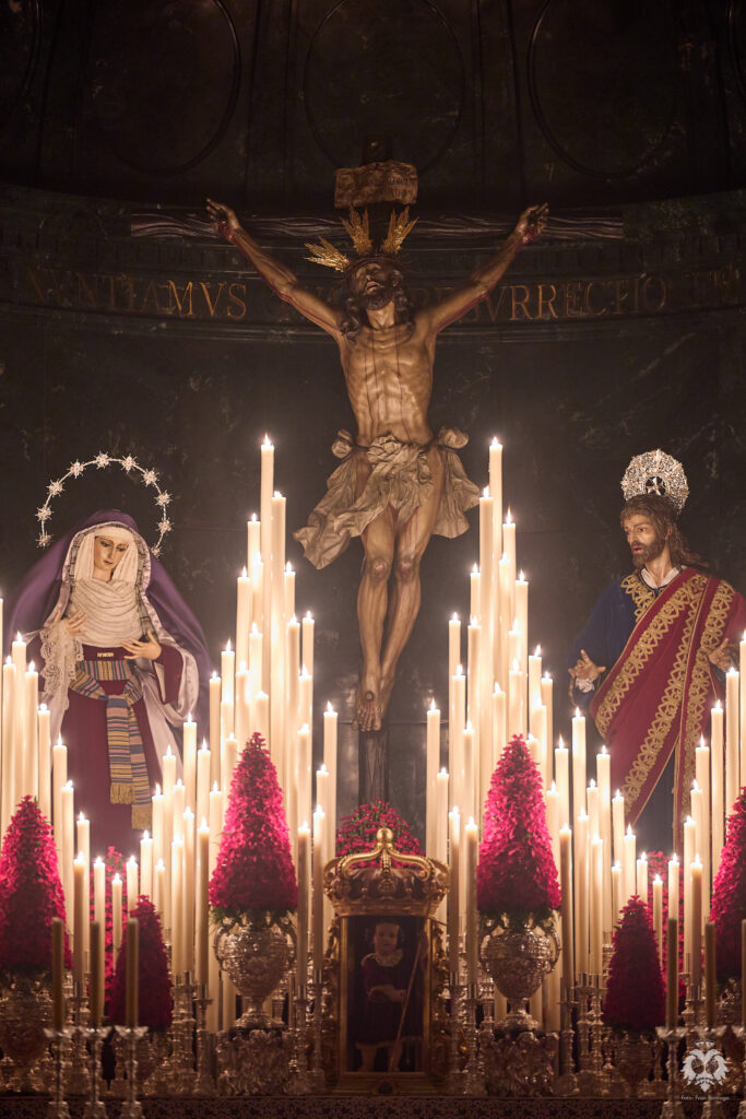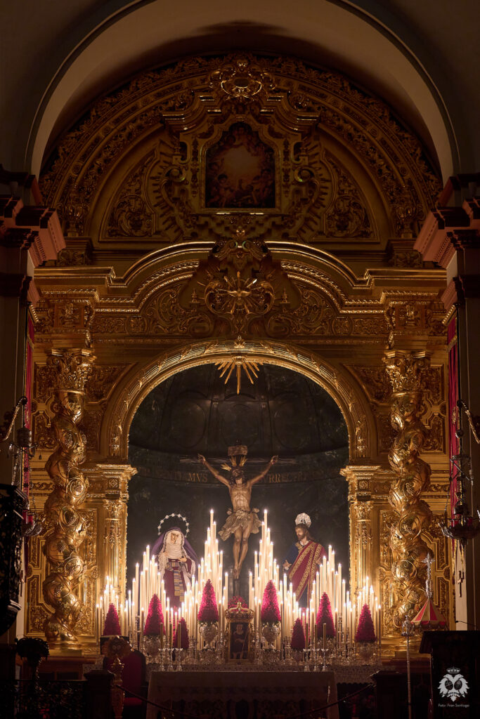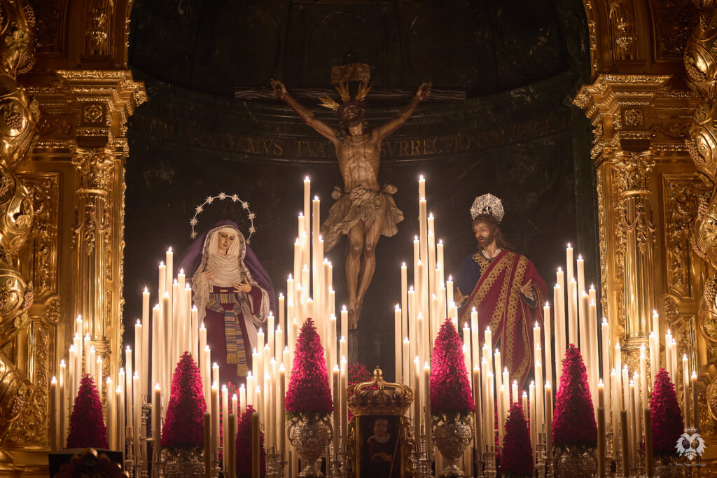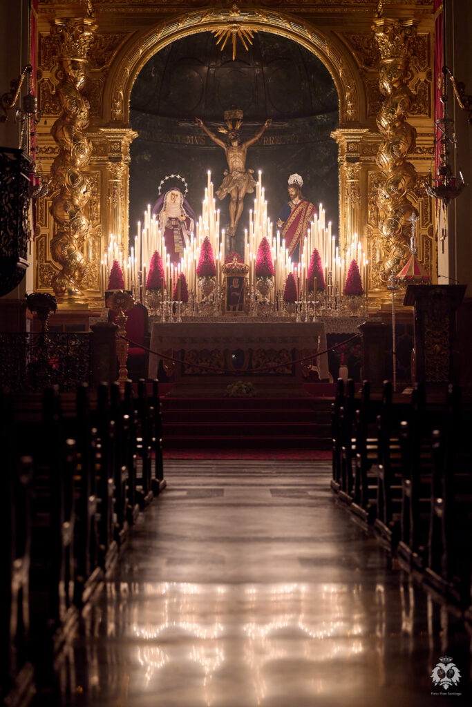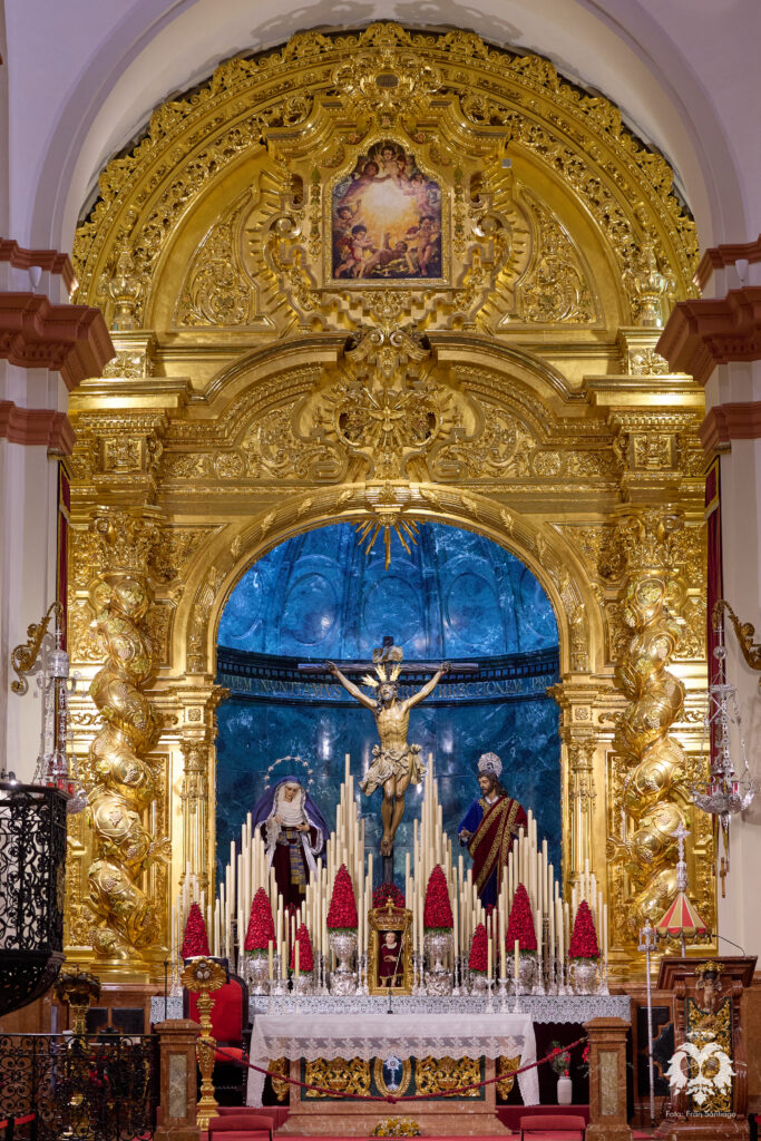 Este ha sido el altar dispuesto por parte del grupo de priostía de la Hermandad para el Solemne Quinario en honor del Santísimo Cristo de la Expiración y Nuestra Madre y Señora del Patrocinio. La Santísima Virgen ha sido vestida de hebrea como cada cuaresma por parte de su vestidor Antonio Bejarano y, para esta ocasión, completa el altar la figura de San Juan que durante el resto del año recibe culto en la Capilla Sacramental.