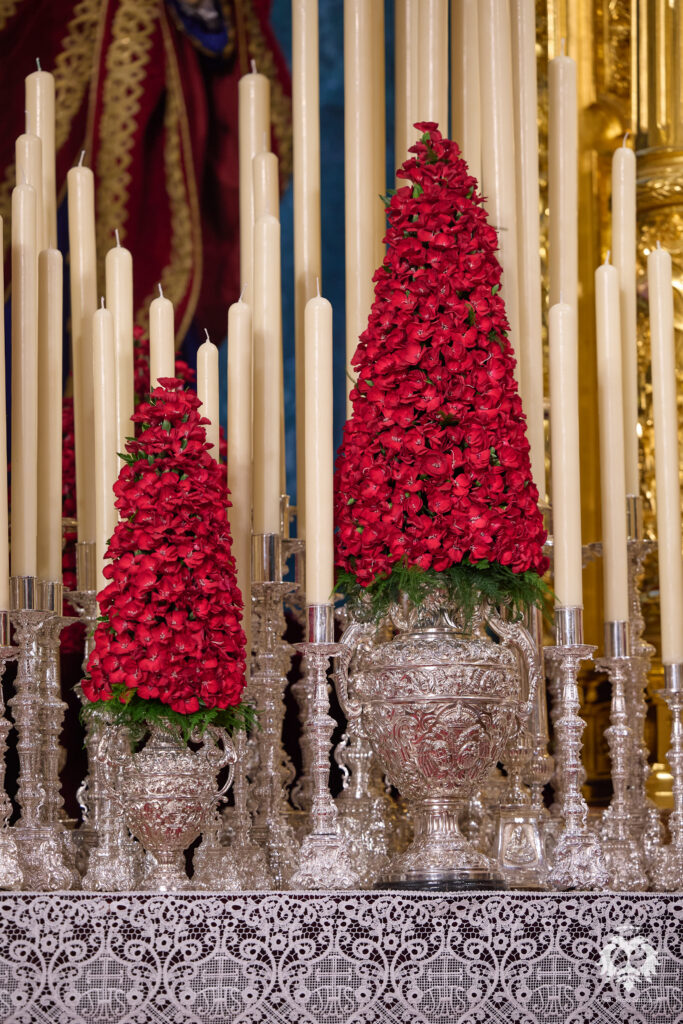 El exorno floral para este año ha consistido en solomias presentadas de forma cónica sobre las jarras de orfebrería que cada año acompañan a Nuestra Madre y Señora del Patrocinio en su paso de palio por parte de la floristería de Miguel Murillo.